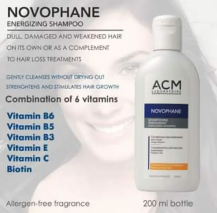 Apply ACM Laboratoire Novophane Energizing Shampoo over damp hair and massage in circular motions until it starts to lather. Rinse off and proceed with conditioning and other specific hair loss treatments.